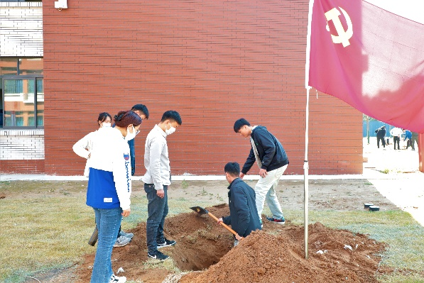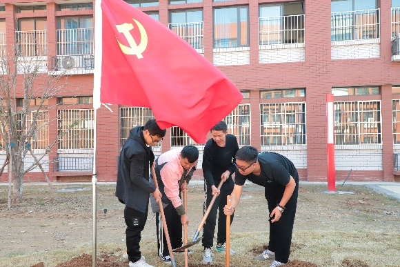 在植树活动现场,党旗飘扬,一片热火朝天的劳动景象。公司党委书记王涛涛、副书记李迎超,常务副经理李水泉,副经理高卫亮率先垂范,撸起袖子同师生党员一同植树。在公司领导的感染下,员工们有的搬运树苗,有的扶苗填坑,有的挥锹培土,有的夯实土层,整个植树现场个个热情高涨,处处洋溢着团结协作的融洽氛围。在大家的共同努力下,经过几个小时的辛勤劳动后,共计完成69棵桃树的栽种工作,一株株树苗昂然挺立,错落有致,展现出一派蓬勃生机。